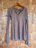 Lightweight wool jersey henley top with a nice amount of give in the fabric. Color is a delicate heathered mauve-brown. Double cuffs with thumbhole on inner layer. Perfect for layering.